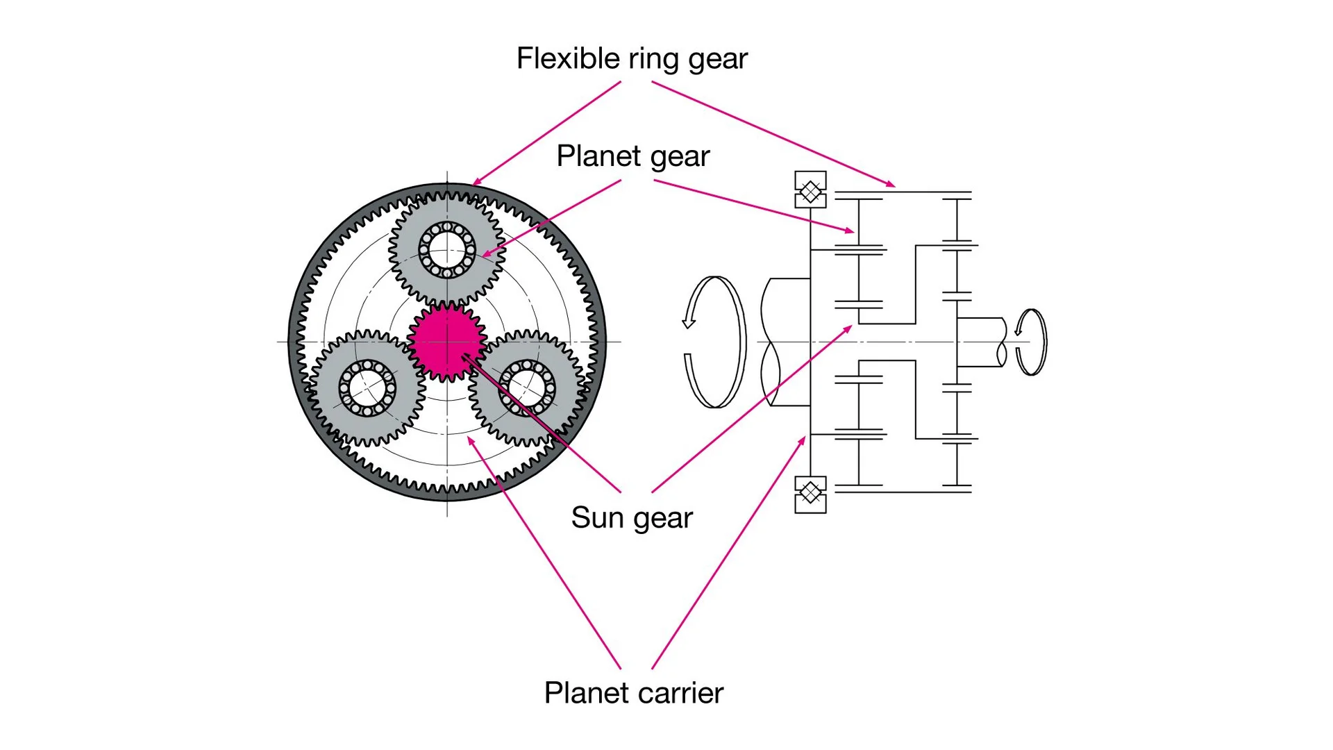Des réducteurs planétaires comprennent plusieurs roues dentées placées autour d’une roue dentée centrale. Et comme ce positionnement rappelle celui des planètes tournant autour du soleil, la roue centrale est aussi appelée soleil et les roues dentées, satellites. Le bord extérieur du réducteur est formé par la couronne à denture intérieure. Le soleil est entraîné par un moteur et transmet son mouvement aux satellites qui se déplacent sur la couronne extérieure et tournent de manière homogène autour du soleil.